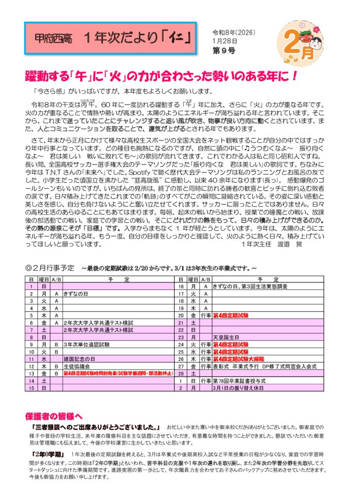 新着 すべて 学校から 各種行事 緊急連絡 2026年1月28日 1年次 1年次だより「仁」第9号(2... 2026年1月21日 高校入試 令和8年度前期募集検査につい... 2026年1月19日 「税に関する高校生の作文」税... 2025年12月24日 1年次 1年次だより第8号(年末号)... 2025年12月15日 n-stage n.stage 81号 2025年12月11日 2年次修学旅行 令和7年度 修学旅行4日目(... 2025年12月10日 修学旅行 令和7年度 修学旅行3日目 2025年12月9日 2年次修学旅行 令和7年度 修学旅行2日目 2026年1月28日 1年次 1年次だより「仁」第9号(2... 2026年1月21日 高校入試 令和8年度前期募集検査につい... 2026年1月19日 「税に関する高校生の作文」税... 2025年12月24日 1年次 1年次だより第8号(年末号)... 2025年12月15日 n-stage n.stage 81号 2025年12月11日 2年次修学旅行 令和7年度 修学旅行4日目(... 2025年12月10日 修学旅行 令和7年度 修学旅行3日目 2025年12月9日 2年次修学旅行 令和7年度 修学旅行2日目 2025年12月11日 2年次修学旅行 令和7年度 修学旅行4日目(... 2025年12月10日 修学旅行 令和7年度 修学旅行3日目 2025年12月9日 2年次修学旅行 令和7年度 修学旅行2日目 2025年12月8日 2年次修学旅行 令和7年度 修学旅行1日目 2025年11月10日 甲府市立西中学校の皆さまより... 2025年6月24日 鳳凰祭(学園祭) 第74回鳳凰祭の開催について 2025年4月8日 鳳凰学(総合的な探究) 上野ミュージアムツアーを開催... 2025年3月24日 1年次2年次国際交流 マレーシア短期留学(最終) 緊急連絡はありません。 一覧を見る 学校から 各種行事 部活動の様子 2026年1月26日 吹奏楽 西関東アンサンブルコンテスト... 2026年1月26日 吹奏楽 山梨吹奏楽コンクール新人戦に... 2026年1月9日 書道 【書道部】新年書道作品の展示 2025年12月24日 吹奏楽 山梨県アンサンブルコンテスト... 「部活動の様子」一覧 各部のページ 西高の魅力 「県下唯一の65分授業」「単位制の多様な選択科目」など、学習意欲を高める授業はもちろん、部活動の奨励も行っています。 n.stage n.stageの「n」は西高の「n」! 部活動や行事、進路など、甲府西高等学校での学生生活の魅力が満載の広報誌。 部活動 部活動は西校生活を楽しくし、潤いを与えてくれます。「文化局」「体育局」のそれぞれの活動状況を紹介します。 各種行事 過去に実施した主な学校行事について紹介しています。