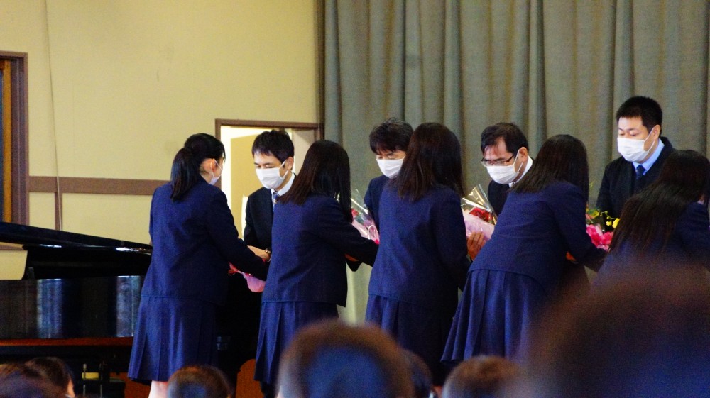 離退任式では、時間の制約もある中、離退任する先生方から貴重なお言葉をいただき、生徒を代表して先生方へ感謝の言葉が述べられました。