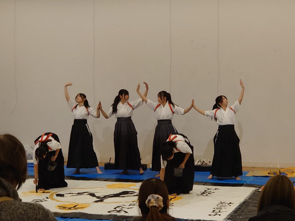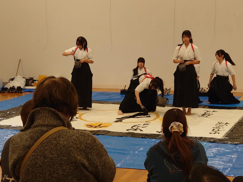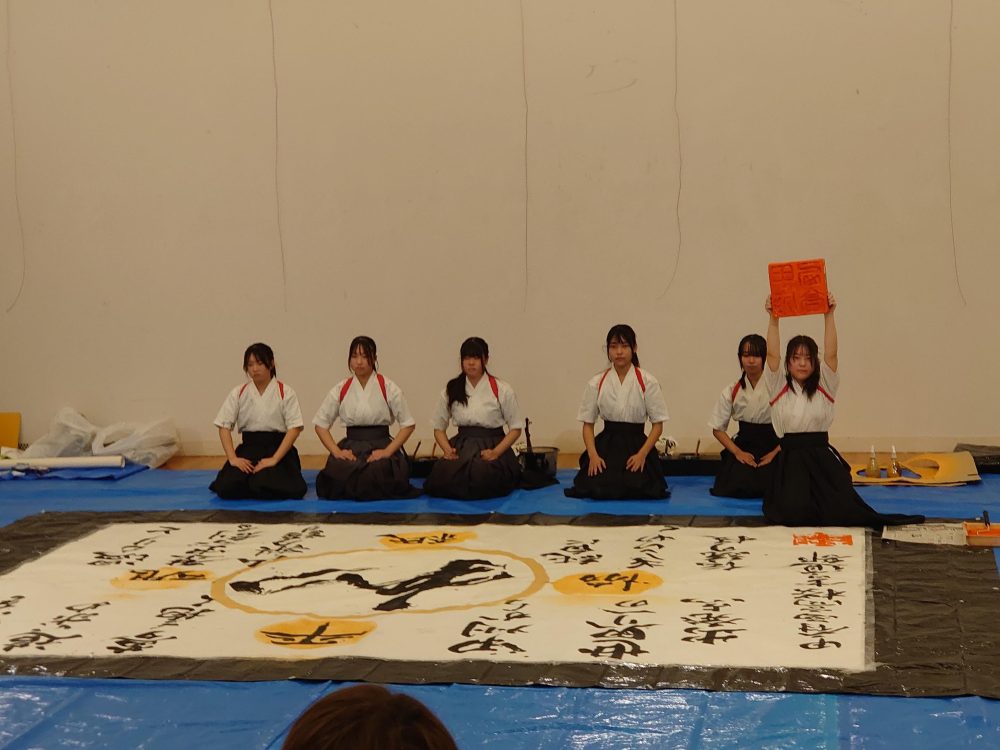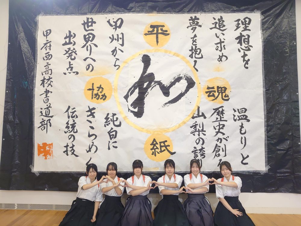 ホーム202512月【書道部】第5回甲州和紙まつり 2025年12月9日カテゴリー: 部活動 書道 【書道部】第5回甲州和紙まつり 令和7年12月6日道の駅にしじま和紙の里かみすきパーク 書道部が第5回甲州和紙まつりで書道パフォーマンスを披露しました。 今回の作品テーマは「人を繋ぐ和紙」です。 作品制作にあたり、私たちはまず和紙の歴史について調べました。 そして和紙が多くの人を魅了し、連綿と受け継がれてきた伝統であることを知りました。 伝統を繋いできた人々の絆、和紙の魅力を伝えたいという想いを込めてパフォーマンスをしました。 初めての1年生だけでのパフォーマンスに緊張しましたが、私たちの想いを届けることができたと思います。 この経験を糧に、さらなる表現を探求していきたいと思います。