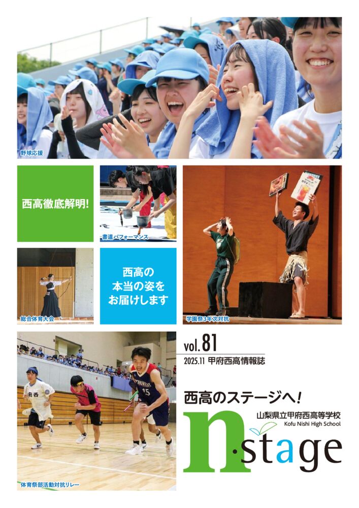 ホーム学校から 学校から 2025年12月15日 n.stage 81号 2025年12月11日 令和7年度 修学旅行4日目(最終日) 全ての参加生徒は首里城見学を終え、無事に羽田空港に到着しました。 バスで山梨へ向けて出発しました。 2025年12月10日 令和7年度 修学旅行3日目 修学旅行3日目の行程を終えました。 本日はクラス別研修で各クラス沖縄の自然について体験し、学びました。 国際通り散策も無事に終え、生徒全員ホテルに戻っています。 明日は首里城を見学し、帰路につきます。 2025年12月9日 令和7年度 修学旅行2日目 本日も無事に2日目の日程を終えました。 今日はマリン体験やジャングリア見学、美ら海水族館見学など、楽しみながら沖縄を体験しました。 2025年12月8日 令和7年度 修学旅行1日目 修学旅行団は無事に本日(1日目)の行程を終了しました。 2025年12月8日 3年次だより第7号(12月号) 3年次だより第7号(12月号)ができました。 高校最後の定期試験も終わり,共通テストまで50日をきっております。 がんばれ西高生! 西高生は最後まで伸びるっ!!! 今月の職員エッセイは3組です! 下↓の画像をクリックしてご覧ください! 2025年11月27日 1年次だより第7号(12月号)ができまし... 2025年11月10日 甲府市立西中学校の皆さまよりお花をいただ... 令和7年11月4日に甲府市立西中学校の皆さまが大切に育てたお花をいただきました。 こちらは鉢に植え直し、各HR教室に置かせていただきます。 甲府市立西中学校の皆さま、ありがとうございました。 2025年11月10日 3年次だより第6号(11月号) 3年次だより第6号(11月号)です。 今年も彗星の観測・撮影ができました! 職員のエッセイは2組の担任&副担任です。 下↓の画像をクリックしてご覧ください。 2025年10月30日 1年次だより第6号(11月) 1 / 3712345...102030...»最後 »