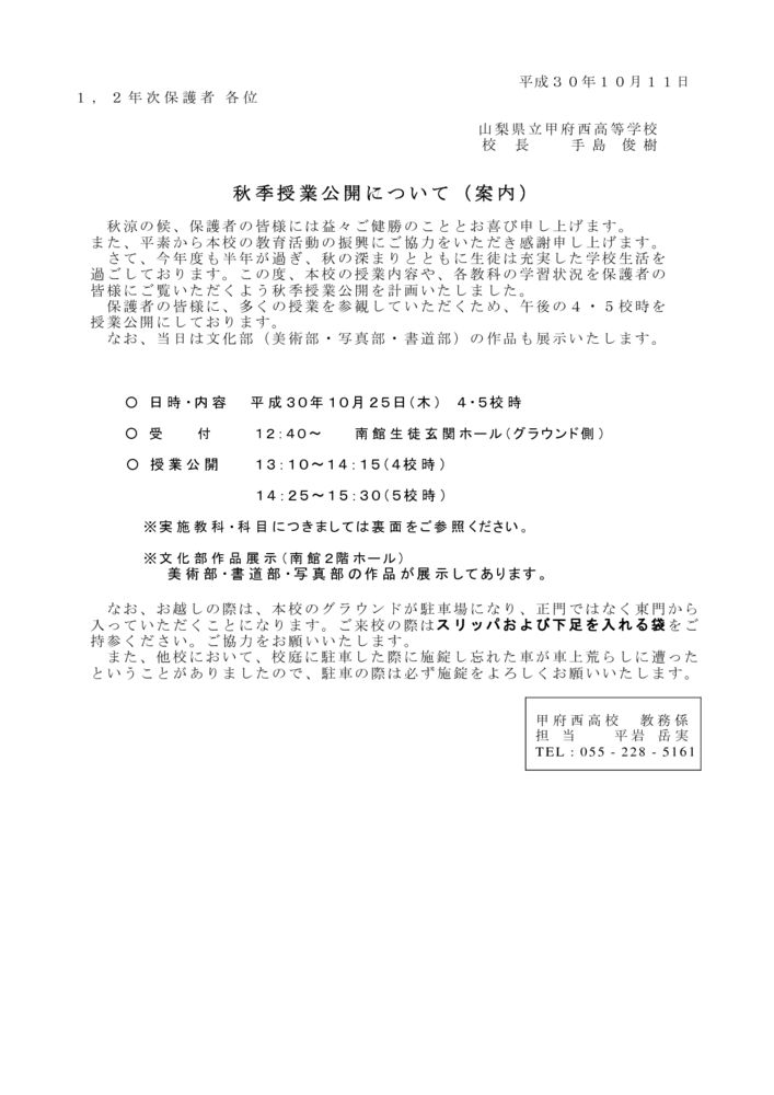 ホーム201810月 2018年10月 2018年10月31日 保健室・相談室便り 11月号 2018年10月30日 n-stage第55号 西高のステージへ! 2018年10月27日 1年次 キャリアガイダンス(職業編) 10月26日(金)に1年次鳳凰学(総合的な学習の時間)においてキャリアガイダンス(職業編)を実施しました。当日は県内で社会人として活躍されている5人のOB・OGを講師としてお招きし、仕事のやりがいや大変なところ、その仕事を選んだきっかけ、高校時代や大学時代にすべき事などパネルディスカッション形式でお話しいただきました。先輩方の西高時代の過ごし方は今の1年生にとっても大変参考にな... 2018年10月27日 外務省「高校講座」 10月18日(木)に本校において外務省による1,2年次対象の「高校講座」が実施されました。講師の萩野淳年先生(外務省総合政策局国際機関人事センター課長補佐 元在ルーマニア日本大使館勤務)からルーマニアの話や外務省の仕事内容また将来グローバルな人材として活躍するために高校生としてすべき事などを講演していただきました。 2018年10月26日 1年次 鳳凰学 キャリア教育講話「国際的... 10月17日(水)に本校1年次を対象としてキャリア教育講話「国際的な視点を持とう」を、慶應義塾大学総合政策学部2年在籍の吉野裕斗さんを講師として講演していただきました。吉野さんは中学時代からボランティア団体を設立、高校時代に世界一周を試みるなど主体的に行動すれば自ずと結果や評価は与えられるものと大学生の今も志を高く意欲的に活躍していることから、今後西高生も夢を持って主体的に取り... 2018年10月26日 西日本豪雨震災義援金の募金活動 昨日は午後より、1,2年次生を対象とする秋季授業公開が行われました。保護者受付において、本校PTA活動の取り組みとして「西日本豪雨震災義援金の募金活動」が実施され、多くの保護者の皆様にご協力をしていただきました。 (募金総額17928円) ありがとうございました。 2018年10月24日 平成30年度秋季授業公開 クリックして、内容をPDFでご覧いただけます。授業内容・授業場所が2ページ以降に記載されています。 2018年10月23日 10月報告会・後期生徒総会 10月19日(金)報告会・後期生徒総会が行われました。 報告会では、前回の報告会から間もない時間でしたが、男子バドミントン部、文芸部 、英語科、卓球部、演劇部、弓道部から大会結果報告が行われました。次回の活躍も期待します。 引き続き、後期生徒総会。総会では次年度の学園祭について活発な議論を繰り広げていました。 2018年10月23日 第22回健康の森ウォーキング大会を実施し... 10月10日(水)、爽やかな秋晴れの中、健康の森ウォーキングが実施いたしました。 ウォーキングを通して自己の能力に応じて計画的に歩行することを体験し、健康や安全に関する理解を深めたと思います。 大会に際しましては、多くの保護者の皆様および地域の方のご協力のもと、無事終了できました。この場をお借りして御礼申し上げます。ありがとうございました。 ... 2018年10月9日 関東選抜大会出場決定 県高校新人大会女子シングルスで1-5の平野世和さんが優勝、女子学校対抗で第2位となり、12月24日(月)~26日(水)に千葉県千葉市で行われる関東選抜大会への出場権を獲得しました。一致団結して頑張ります!応援ありがとうございました。 1 / 212»