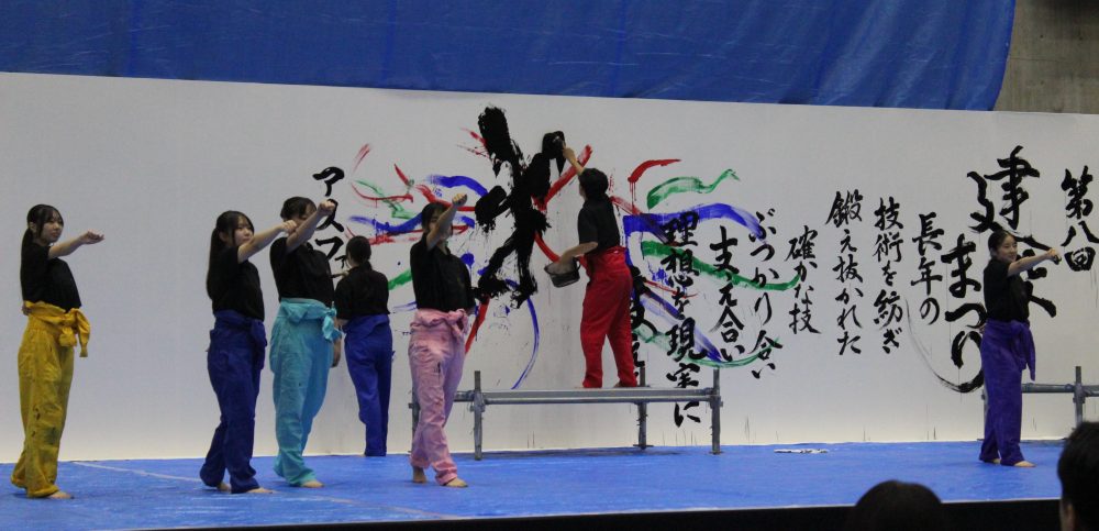 ホーム202510月27 2025年10月 2025年10月27日 【書道部】第8回建設まつり書道パフォーマ... 令和7年10月25日アイメッセ山梨 書道部が第8回建設まつりで書道パフォーマンスを披露しました。 今回の作品テーマは「憧れの新時代」です。私たちの生活を支える建設業のこれまでとこれからをどのように表現するか、言葉や動き、紙面構成を部員みんなで考えました。 初挑戦となる壁面への揮毫に初めは戸惑いましたが、練習を重ねて迫力あるパフォーマンスをす...
