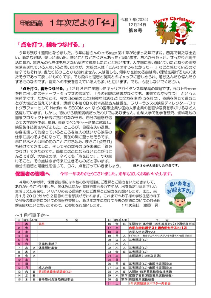 ホーム202512月24 2025年12月 2025年12月24日 山梨県アンサンブルコンテストに出場しまし... 12月21日(日)に山梨県アンサンブルコンテストが開催され、 トロンボーン3重奏と打楽器6重奏が出場しました。 トロンボーンは銀賞、打楽器は金賞を受賞しました。 また、打楽器は山梨県代表として西関東アンサンブルコンテストに出場させていただくことになりました。 次の大会でも頑張ります。 応援ありがとうございました。 2025年12月24日 1年次だより第8号(年末号)ができました...