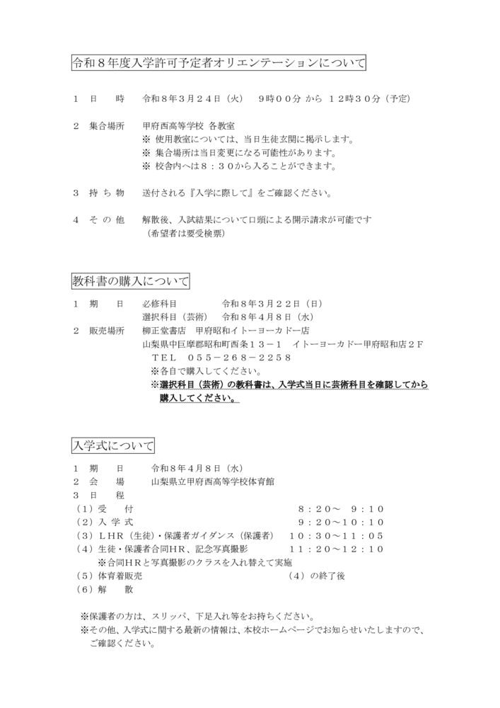 ホーム20263月12 2026年3月 2026年3月12日 球技大会 3月11日(水)青空の下、球技大会を実施しました。 1、2年生が汗を流して、スポーツを楽しみました。 ドッチボールやバスケットボール、フットサルなど、定番の種目だけでなく、 ボッチャやモルックなど、普段なかなか触れることのない種目もあります。 最後には、生徒vs教員というエキシビションマッチも実施。 笑顔のうちに、球技大会を終えました。 2026年3月12日 情報モラル講演会を実施しました 3月9日(月)に、情報モラル講演会を実施しました。 山梨県警生活安全部の方から、お話し伺いました。 日頃使っているインターネットに多くの危険が潜んでいることを学び、 今後のICT機器との使い方を考える時となりました。 2026年3月12日 合格発表から入学式までの日程 2026年3月12日 令和8年度高校入試合格発表 入学許可予定者はこちらからご覧ください(PDF) 高校入試合格発表後の日程については、こちらをご覧ください。